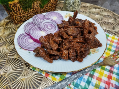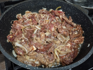 Когда лук будет готов, отправьте в сковороду кусочки говядины вместе с маринадом. Жарьте мясо с луком, постоянно помешивая, на сильном огне. Для этой процедуры достаточно минут 10-15.