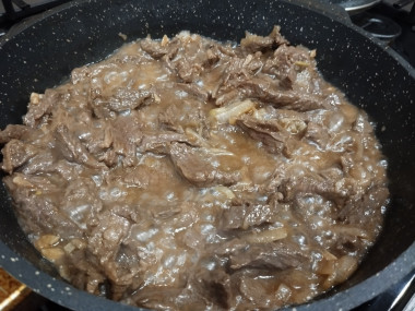 Затем выложила мясо на сковороду к луку, перемешала и обжарила,помешивая. Добавила немного воды и протушила до готовности.