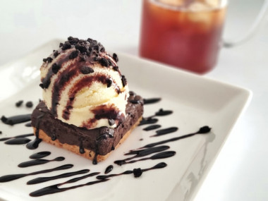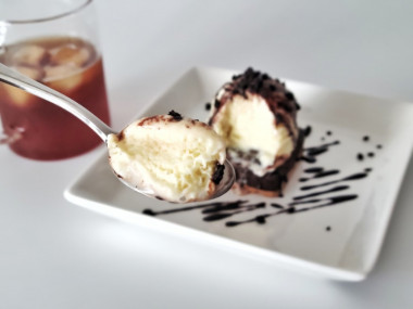 Я съела шарик мороженого, а потом решила сделать из него десерт. Выложила по шарику мороженого на шоколадное бисквитное печенье, сверху украсила шоколадным сиропом и мелкими кусочками шоколада. Получился обалденный десерт. Сливочно-ванильное мороженое в сочетании с шоколадом - это очень вкусно! Да ещё бисквитное печенье отлично сочетается с мороженным. Такой десерт можно и гостям на праздник подавать. Красиво выглядит и вкусно.