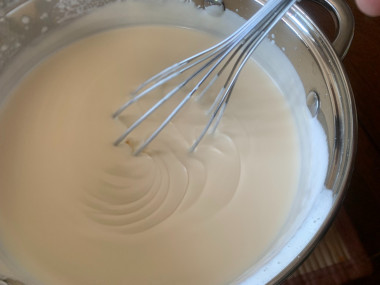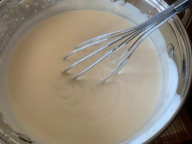 Порциями влейте в желтковую массу молоко, хорошо размешивая ее после каждого добавления.