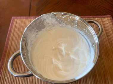 Вмешайте крем в сливки. Получится однородная довольно жидкая масса, очень похожая на вкус на растаявшее мороженое.