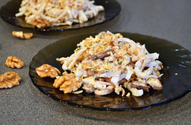 Салат с кальмарами, грибами и грецкими орехами выложите горкой на тарелку и посыпьте оставшимися рублеными грецкими орехами. Салат украсьте свежей зеленью и подайте к столу. Приятного аппетита!