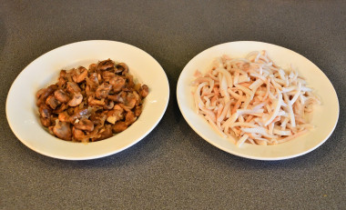 В сухой сковороде на среднем огне обжарьте грибы 3-5 минут до золотистой корочки. Затем влейте растительное масло. Добавьте лук и немного соли. Жарьте, помешивая, около 5 минут. Грибы с луком охладите. Готовьте салаты только из полностью охлажденных продуктов. Приготовленный из теплых, салат может быстро испортиться. Как правильно выбрать сковороду для жарки можно узнать, прочитав статью по ссылке в конце рецепта.