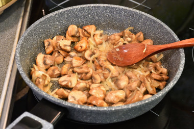 Шампиньоны вымойте, обсушите. Крупные грибы нарежьте пластинками, средние и мелкие – разрежьте на 4 части. Помимо шампиньонов можете использовать любые другие грибы по вкусу. Но их, возможно, придется предварительно отварить, особенно если это свежие лесные грибы.