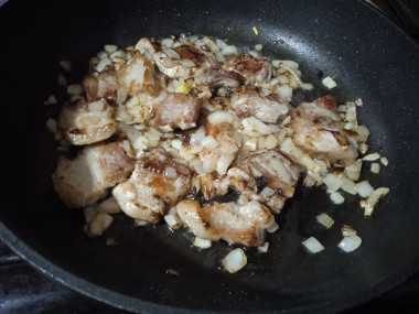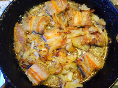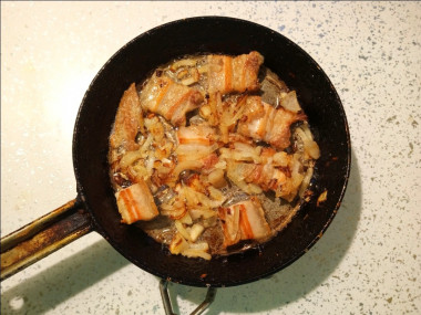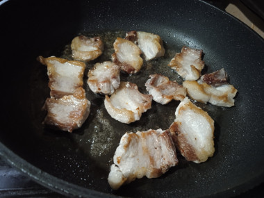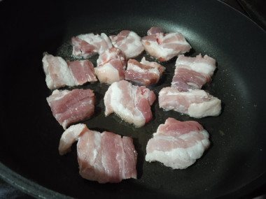 Нарежьте сало с прослойкой на кусочки и выложите на хорошо разогретую сковороду, с добавлением небольшого количества растительного масла.