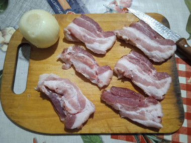 Как пожарить сало на сковороде? Подготовьте необходимые ингредиенты. Для жарки можно использовать чистое сало, но я предпочитаю сало с мясной прослойкой. Ориентируйтесь по своему вкусу. Чтобы блюдо получилось нежным и мягким, выбирайте грудинку молодого поросенка. Для того, чтобы можно было нарезать сало тонкими ломтиками, его необходимо немного подморозить. Лук очистите от шелухи и промойте в холодной проточной воде.