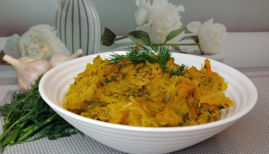 Готовилось блюдо 45 минут, в самом конце я добавила мелко нарезанный укроп. На мой взгляд, такая капуста прекрасно сочетается с мясными блюдами, со свежим хлебом, картофельным пюре, рисом, а так же прекрасно подойдет как начинка для пирожков, пирогов, кутаб, чуду. Спасибо автору за вкусный рецепт!