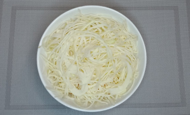 Репчатый лук очистите от шелухи, помойте, промокните салфеткой и мелко порежьте ножом. Если есть красный лук, можно использовать его, он более сладкий. Чтобы при нарезке лука не раздражалась слизистая глаз, промойте луковицу и нож холодной водой. Разделочная доска не впитает неприятный луковый запах, если перед нарезкой натереть ее кусочком лимона.