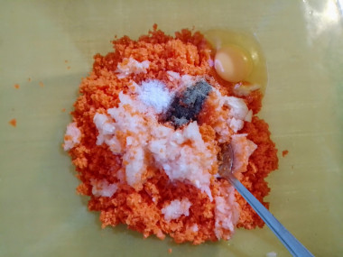 Сложите в миску натертые морковь и лук, вбейте к ним яйцо. Посолите и поперчите по вкусу. Если блюдо будут есть дети, можете не добавлять в него перец. Перемешайте морковную массу. Если она у вас получилась очень сухой, то влейте в нее немного кефира, совсем чуть-чуть, буквально пару ложек.