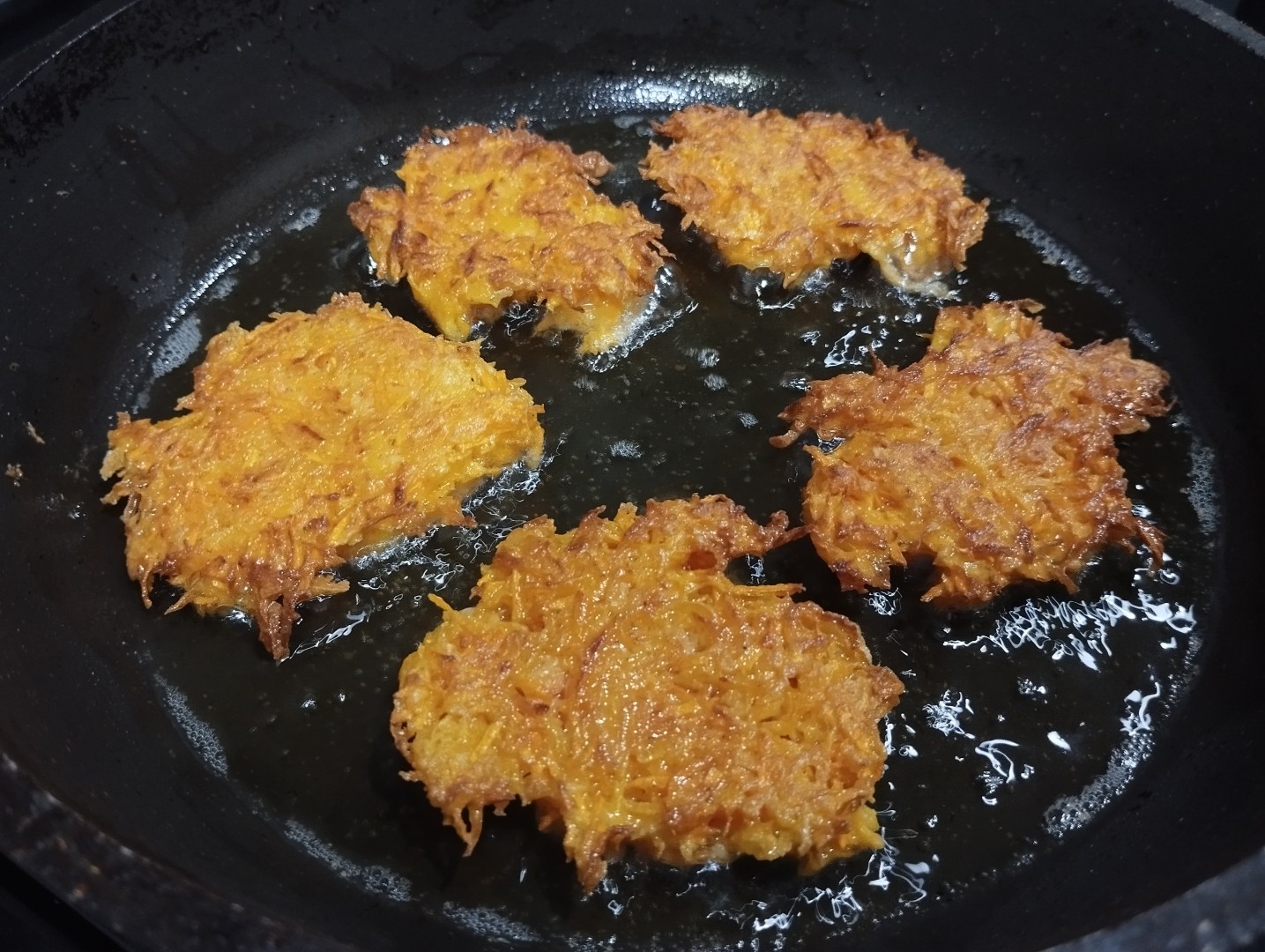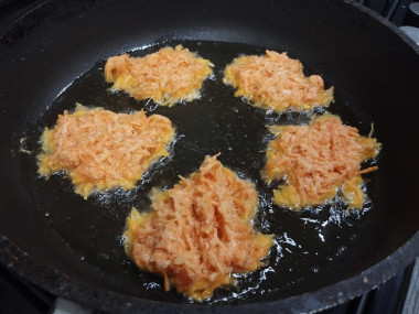 Жарьте оладьи до румяности на одной стороне, около 5 минут, затем переверните на другую. Аналогично пожарьте их с другой стороны. Готовые оладьи снимите со сковороды. Перед следующей партией добавьте на нее еще немного масла. Пожарьте таким образом все тесто. У меня из двух средних морковок получилось 8 оладушек.