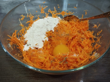 Начните добавлять в морковь муку. Сначала одну столовую ложку, перемешайте. Затем другую. Тесто должно получиться однородным и не распадающимся на куски. Если оно не такое, то добавьте еще немного муки.