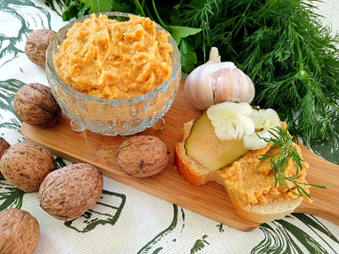 Даже не представляла, что получится так вкусно! Фасоль так здорово сочетается с грецким орехом! Я, правда, без моркови делала,но не думаю, что это критично.