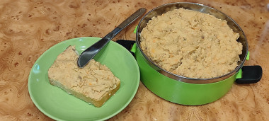Паштет из фасоли по этому рецепту получился просто великолепным! Никогда бы не подумала, что обычная фасоль может быть такой вкусной) Для паштета я взяла белую фасоль, замачивала ее на ночь, а утром отварила до готовности. Лук для зажарки нарезала довольно крупно, все равно его перемалывать) Грецкие орехи предварительно обжарила, так они получаются вкуснее и ароматнее. Измельчать все ингредиенты решила в чаше блендера. По мере взбивания добавляла понемногу воду, добиваясь мягкой пастообразной консистенции. На вкус паштет просто шикарный! У него нежная, бархатистая структура. Вкус немного остренький, особенно интересно ощущать маленькие кусочки чеснока в общей массе. Мы намазывали паштет на кусочки батона, а ещё я делала маленькие бутербродики с солёным огурцом, укропом и маринованным луком. Очень вкусно, всем советую!