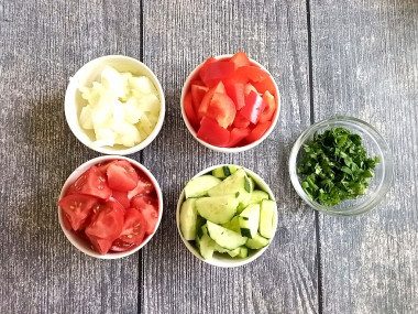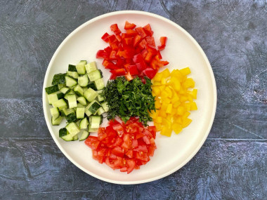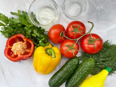 Как сделать летний салат огурцы, помидоры? Подготовьте для этого необходимые ингредиенты. Пропорции овощей можно немного изменить по своему вкусу и наличию. Можно добавить другие овощи по вкусу. Болгарский перец можно взять один любого цвета или половинки разных цветов. Я беру разные. Зелень может быть любая - укроп, петрушка, зеленый лук и пр. Перед началом приготовления все овощи тщательно помойте в проточной воде и обсушите.