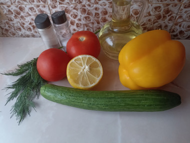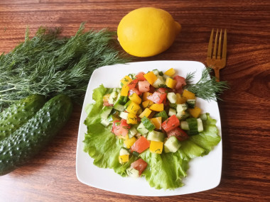 Сделала салат летний огурцы помидоры. Овощи ещё конечно тепличные, а не грунтовые, но всё равно салат получается яркий, сочный, хрустящий, очень аппетитный. Из зелени я использовала укроп и зелёный лук. Вместо оливкового масла - подсолнечное. Обычно в подобный салат я не добавляла лимонный сок, полагая, что кислоты от помидор будет достаточно, но оказалось, что лимонный сок прекрасно дополняет свежие овощи. Спасибо за рецепт, Юлия М!