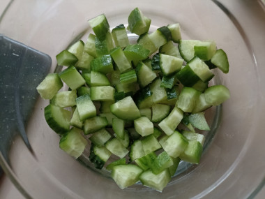 Свежий огурец нарежьте небольшими кубиками и переложите в чашу в которой будете готовить салат. Нарезка всех овощей может быть любой. Если хотите, то можно нарезать овощи крупными ломтиками.