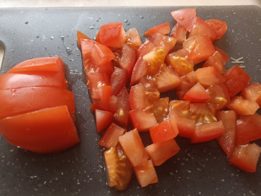 Помидоры берите спелые, сочные, но не мягкие. Мягкие плоды плохо держат форму и могут испортить внешний вид готового блюда. Разрежьте их пополам и удалите плодоножку. Нарежьте помидоры кубиками и добавьте в чашу к салату.