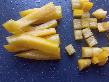 Болгарский перец разрежьте напополам и удалите из него семена. Нарежьте перец полосочками, а затем кубиками. Так же добавьте его к салату.