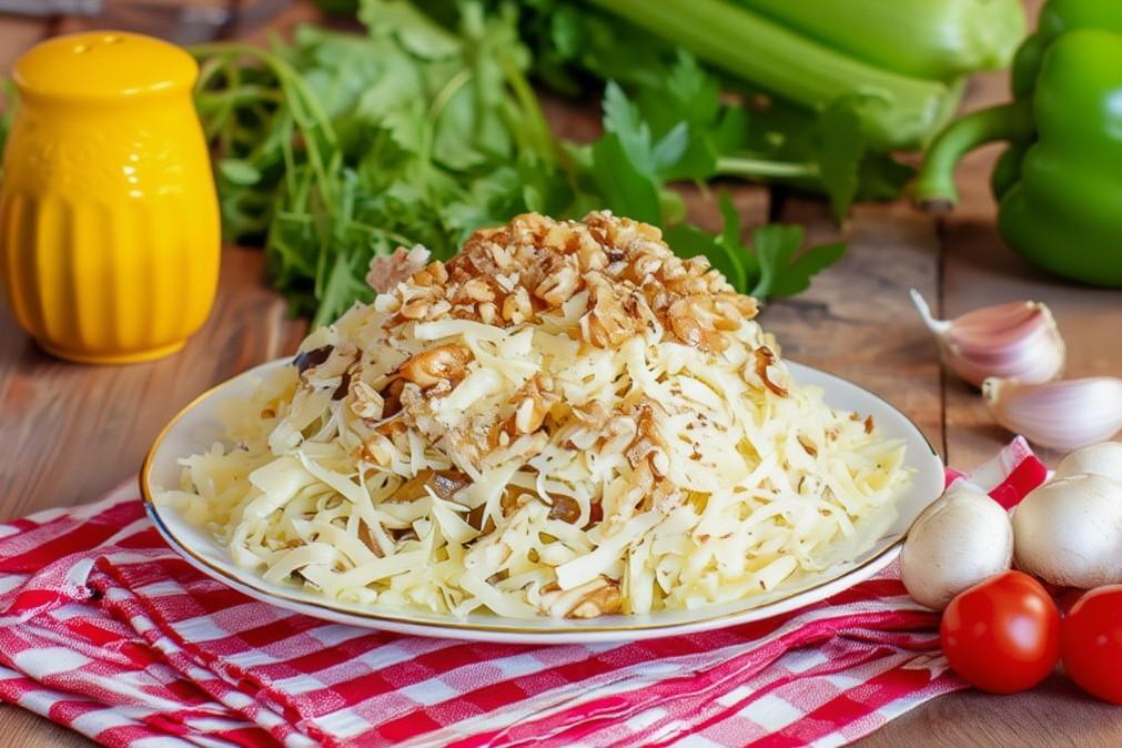 Очень вкусный и простой слоеный салат курица с грибами и грецкими орехами к праздничному застолью! Быстро и просто приготовить, а на вкус изумительный! Очень удачное сочетание орешков и курицы с прочими ингредиентами. Спасибо за рецепт!