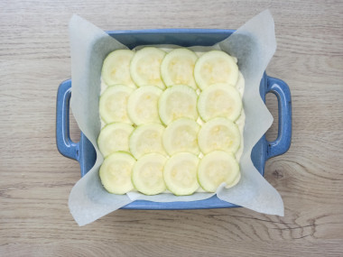 Форму для запекания смажьте растительным маслом. С выбором формы для выпекания и растительного масла вам помогут статьи под рецептом. Выложите равномерно треть творожной массы. Сверху уложите слой кабачков. Затем снова слой творожной массы.