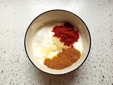 В этот раз мне захотелось заменить треть сметаны на майонез. Смешала эти два ингридиента, а затем добавила соль, паприку, свежий чеснок и приправу для курицы. Эта приправа мне нравится по составу, она ароматная, остренькая и дает красивый цвет.