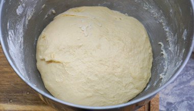 Замешивайте тесто, чтобы оно почти перестало липнуть к рукам. Количество муку в рецепте дано приблизительное. Её может уйти чуть больше или меньше. Ориентируйтесь по консистенции готового теста. Поставьте тесто в теплое место и накройте полотенцем. Оставьте его для подхода на 1-1,5 часа.