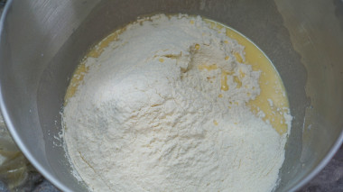 Начните замешивать тесто и постепенно подсыпайте муку. Замес можно делать ложкой, руками или миксером с помощью специальной насадки-крюка для теста.