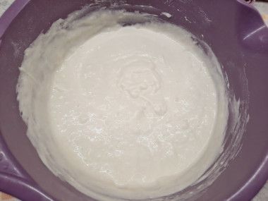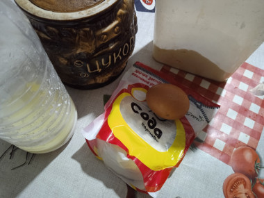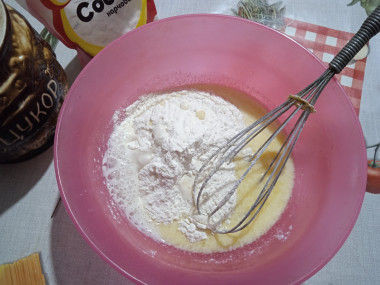 Муку просейте через сито, лучше это сделать несколько раз. Соединяем муку с содой, перемешайте, чтобы сода распределилась по всей муке. И частями всыпьте в миску с жидкостью, каждый раз перемешивая ложкой или венчиком, чтобы не осталось комочков муки. Муки может уйти чуть меньше или больше, нужно ориентироваться по консистенции теста. Оно должно получиться как сметана. Когда тесто готово, оставьте его на столе на 20 минут.