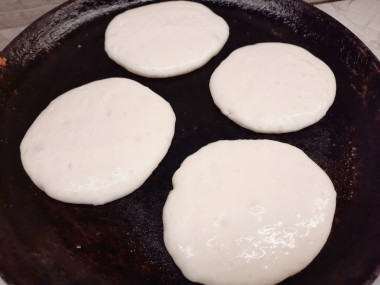 На сковороде разогрейте растительное масло. Выкладывайте тесто столовой ложкой на сковороду, примерно одинакового объема, чтобы оладушки получились одинаковые по размеру и красивые. Жарьте оладушки с одной стороны, пока тесто сверху не схватится и не появятся пузырьки на умеренном огне примерно минуты 2-3.