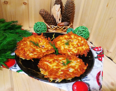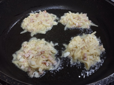 Приготовила картофельные драники с ветчиной и сыром — сытно и хрустяще. Натерла картошку и лук, отжала лишний сок. Добавила мелко нарезанную ветчину, тертый сыр, яйца, муку, соль и перец.