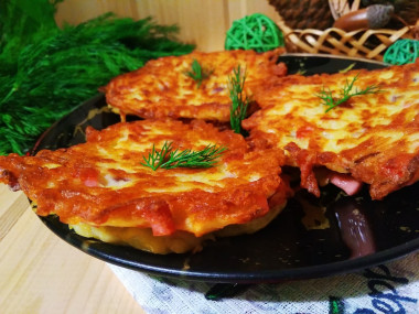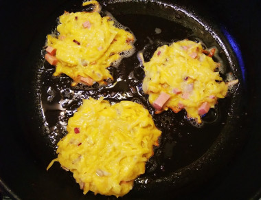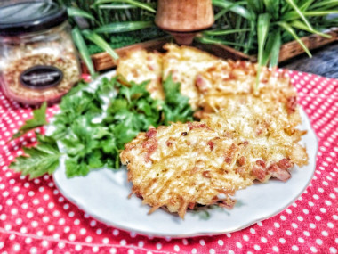 Люблю драники за то, что они похожи на жареную картошку! Когда хочется жареной картошечки, но не хочется ждать когда пожарится целая сковорода, можно сделать мини версию. А в этом рецепте еще есть вкусные добавки в виде ветчины и сыра. Ветчина у меня была заморожена кусочками, я их даже не размораживала, сразу добавила к общей массе. Сыр натерла на крупной терке. Лук взяла фиолетовый, нарезала его кусочками, он в драниках совсем не чувствовался. Из специй только свежемолотый перец. Какие же вкусные драники получились! Даже муж три штуки съел, хотя придерживается диеты) Что уж говорить о детях) Я распределяла массу на сковородке тонким слоем, чтобы быстрее прожарились. Они очень вкусные в горячем виде, настоящая жареная картошка! Ветчина и сыр придают дополнительный яркий вкус.