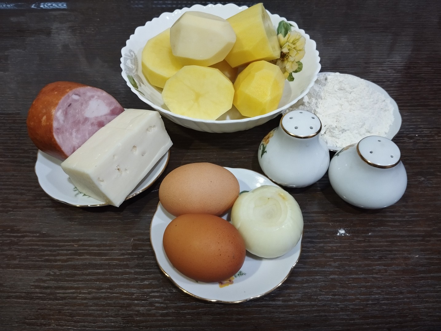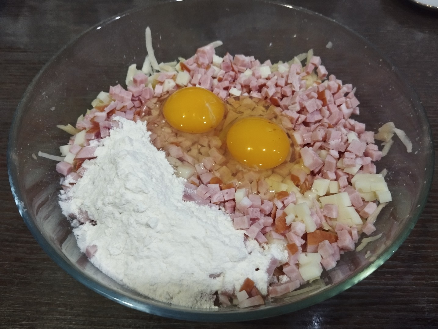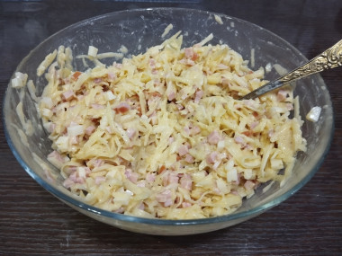 Сыр и ветчину порезала мелкими кубиками, картофель натерла на крупной тёрке.