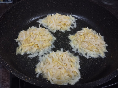 На сковороде разогрейте растительное масло. Столовой ложкой выкладывайте на нее картофельный фарш, формируя оладушки. Драники должны быть тонкими, чтобы картофель хорошо пропекся внутри, тогда они получатся вкусными и хрустящими. Обжарьте драники на среднем огне с одной стороны до румяности.