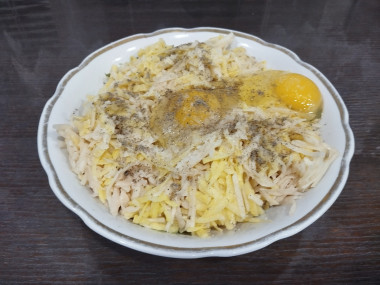 В миску с натертым картофелем вбейте куриное яйцо. Добавьте специи: соль и черный молотый перец по вкусу. По желанию можно добавить еще какие-либо специи, сейчас продают специальные наборы для картофеля. Но мне кажется, что этого минимума достаточно для получения вкусных драников.