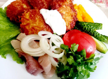 Люблю картошку во всех вариантах, а драники особенно ! И хороши они со всем, что душа пожелает ) Всегда добавляю зелень и два яйца,но муку - никогда ! Тёртую картошку отжимаю, перемешиваю со всем, чем положено. Сливаю аккуратно воду с отстоявшегося после отжима крахмала и добавляю его вместо муки. Прекрасные получаются драники, именно картофельные, без мучной добавки. Но это мой вариант, может кому-нибудь пригодится