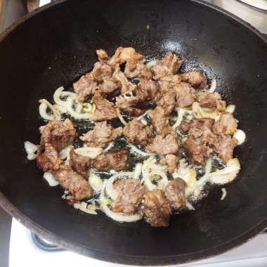 Выложите подготовленное мясо на сухую прогретую сковороду и дайте выпариться лишней жидкости из него. Налейте в сковороду растительное масло и обжарьте мясо, помешивая, на среднем огне до легкой румяности со всех сторон. О том, как подобрать идеальную сковороду, а также как правильно выбрать растительное масло, читайте в отдельных статьях, ссылки в конце рецепта.
