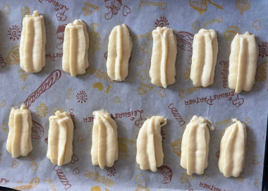 На застеленный пергаментом противень отсадите заготовки длиной 5-6 см на расстоянии друг от друга. Выпекайте печенье в разогретой до 190°С духовке 12-15 минут. Точное время зависит от вашей духовки и личных предпочтений. Следите, чтобы печенье не подгорело снизу. Узнать об особенностях работы духовок можно, прочитав отдельную статью, ссылка в конце рецепта.Шаг 9: