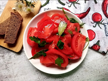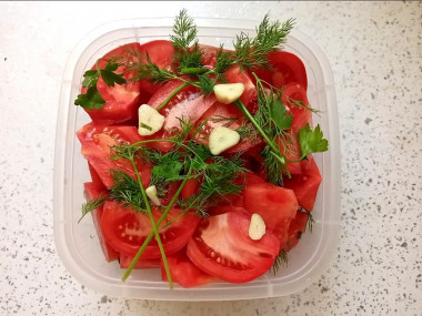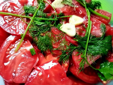 У меня неожиданно оказалось много помидоров, поэтому стала искать на сайте что бы с ними сделать. Нашла подходящий рецепт помидоров малосольных в кастрюле быстрого приготовления. Действительно, приготовление этой закуски занимает мало времени, а результат потрясающий. В роли кастрюли у меня пластиковый контейнер, просто его удобнее ставить в холодильник. Помидоры я нарезала на дольки и уложила в ёмкость слоями. Между слоями помидоров выкладывала веточки петрушки и укропа, а так же пластинки чеснока и горошки чёрного перца. Залила остывшим рассолом и оставила примерно на три часа. После этого убрала на ночь в холодильник. За это время дольки помидоров приобрели вкус не просто маринованных, а скорее даже бочковых. Здесь сочетаются все вкусы: солёный, сладкий, кислый. Всего в меру. И аромат чеснока аппетитный. Никогда не пробовала ничего подобного) Эти вкуснейшие помидорки меня удивили! Советую всем приготовить помидоры по этому рецепту, не пожалеете!