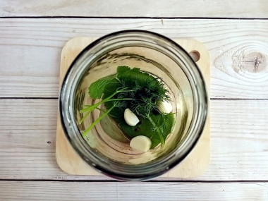 Банку тщательно вымойте. Можно с помощью пищевой соды, затем хорошо ополосните несколько раз в чистой холодной воде. На дно банки уложите несколько веточек укропа и третью часть пластинок чеснока.