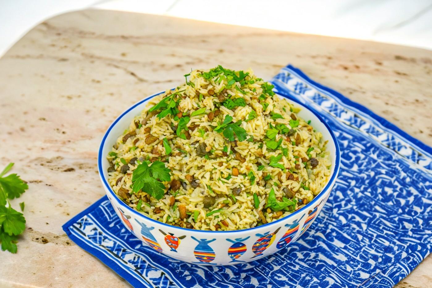 7. Репчатый лук очищаем, нарезаем кубиками. Рис тщательно моем, выкладываем в миску. Добавляем к рису лук и наливаем оливковое масло, все хорошенько перемешиваем. Выкладываем в казан.