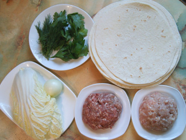 Из необходимых ингредиентов у меня было всё и даже больше. Фарш я взяла двух видов: свиной и куриный, примерно в равных пропорциях. Кроме лука я добавила еще зелень (укроп и петрушка) и пару листиков пекинской капусты (использовала только мягкую, тонкую часть). Так в начинке будет больше овощей и она не сильно "закомкуется" при приготовлении.