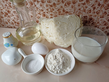 Капусту нашинковала,слегка помяла руками. Добавила соль,перец,яйцо,перемешала. Затем добавила кефир и соду. Муку добавляла постепенно,смотря по консистенции. Тесто получилось как густая сметана.