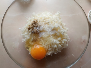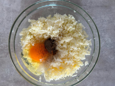 Добавьте к натертой капусте специи по вкусу: соль и черный молотый перец. Если вы планируете жарить сладкие оладушки, то черный молотый перец не добавляйте. Вбейте в миску с капустой куриное яйцо. Перемешайте массу, чтобы яйцо разошлось, а специи смешались с капустой.
