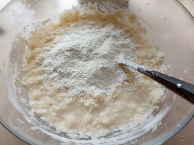 Влейте кефир и добавьте половинку чайной ложки соды. Должна сразу произойти реакция соды с кефиром — щелочи и кислоты. В результате выделится углекислый газ, который и придаст оладушкам пышности. Перемешайте.