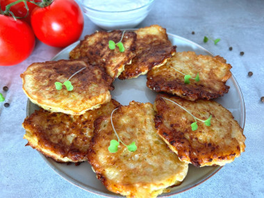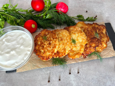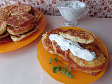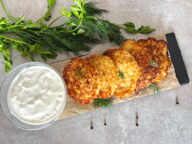 Затем переверните оладьи и жарьте их еще около 5 минут с другой стороны, до румяности. Следите, чтобы оладьи не пригорели. Снимайте оладушки со сковороды на бумажное полотенце, которое впитает лишнее масло. Подавайте оладушки к столу со сметаной или майонезом. Они вкусны как в горячем, так и в холодном виде. Приятного аппетита!
