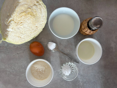 Как сделать капустные оладьи? Подготовьте ингредиенты. От вилка капусты на оладушки уйдет совсем небольшой кусочек, потому что она при натирании на терке дает большой объем.