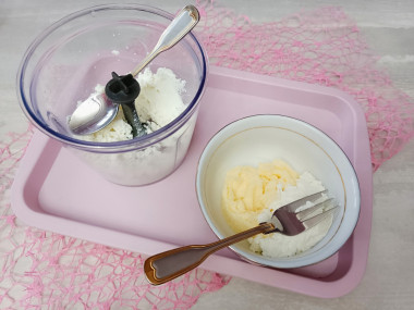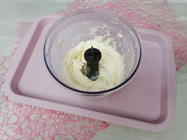 3. В полученную масляную массу небольшими порциями вводим творог. Каждый раз взбиваем до однородности. Таким образом объединяем обе массы полностью. Получаем в итоге нежный пышный крем.
