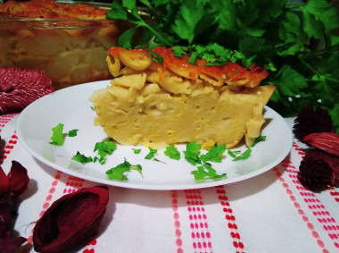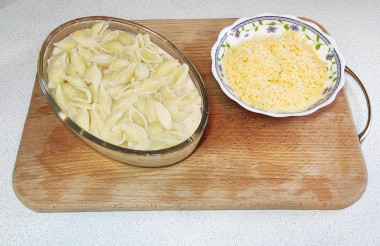 Забегалась по хозяйству и переварила макароны-ракушки. Можно было бы и так съесть, но захотелось придать эстетики блюду. Нашла этот рецепт запеканки и быстренько приготовила полноценный ужин. Главное при этом делать вид, что так и было задумано))) Макарон у меня было 400г., поэтому пересчитала на калькуляторе количество необходимый продуктов, это очень удобно и быстро! В заливку добавила побольше молока, чтобы оно покрыло верх макарон. Сверху посыпала тертым мраморным сыром. Сначала запекала под крышкой, чтобы масса схватилась, а потом без крышки, чтобы сыр запекся в корочку. В целом все вместе довольно быстро приготовилось. Макароны, скрепленные яичной заливкой, хорошо уплотнились и при нарезке кусочки получились ровными, не разваливались. Запеканка вкусная, нежная и аппетитной сырной корочкой. Мы ели ее с салатом из помидоров и лука. Вкусно!