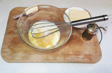 Взбейте их венчиком или вилкой с добавлением соли и черного молотого перца до получения однородной по консистенции смеси.