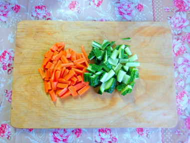 Морковь помойте, очистите и нарежьте тонкой соломкой длиною примерно 3 сантиметра. Огурец помойте, срежьте кончики и нарежьте аналогично морковке - тонкой соломкой длиною по 3 сантиметра. Лук очистите и нарежьте полукольцами. У меня луковица большая, поэтому я нарезала четверть кольцами.